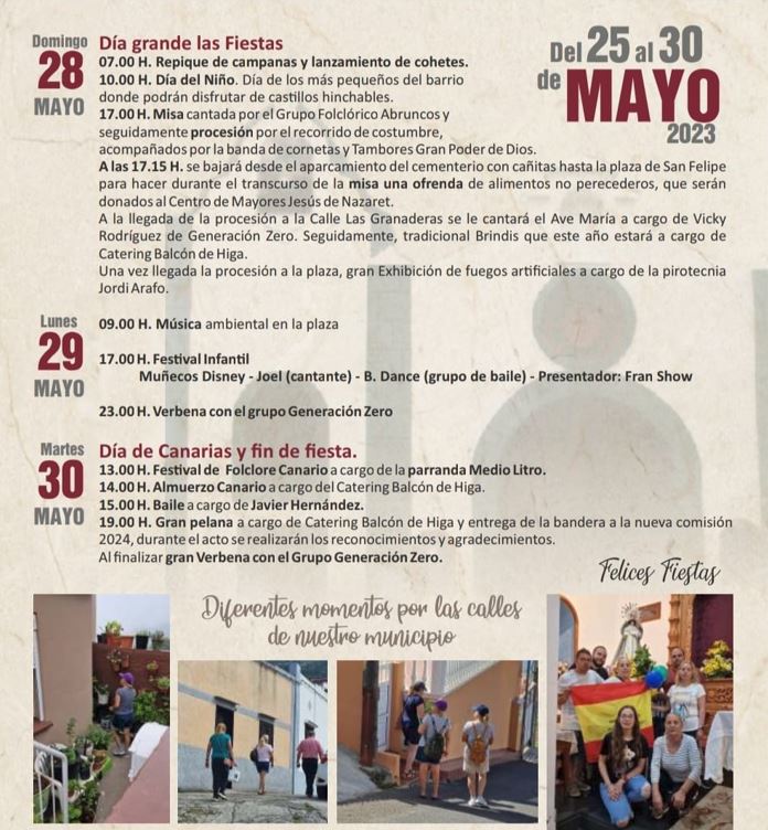 Programa de actos de las Fiestas en Honor a San Felipe Neri y la Virgen de la Salud en el barrio de San Felipe en el municipio de Icod de los Vinos, Tenerife. Del 25 al 30 de mayo de 2023.