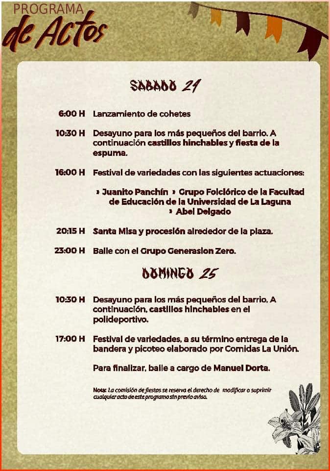 Programa de actos de las fiestas en honor a San Juan Bautista en el barrio de El Amparo en el municipio de Icod de los Vinos, Tenerife. Del 18 al 25 de junio de 2023.