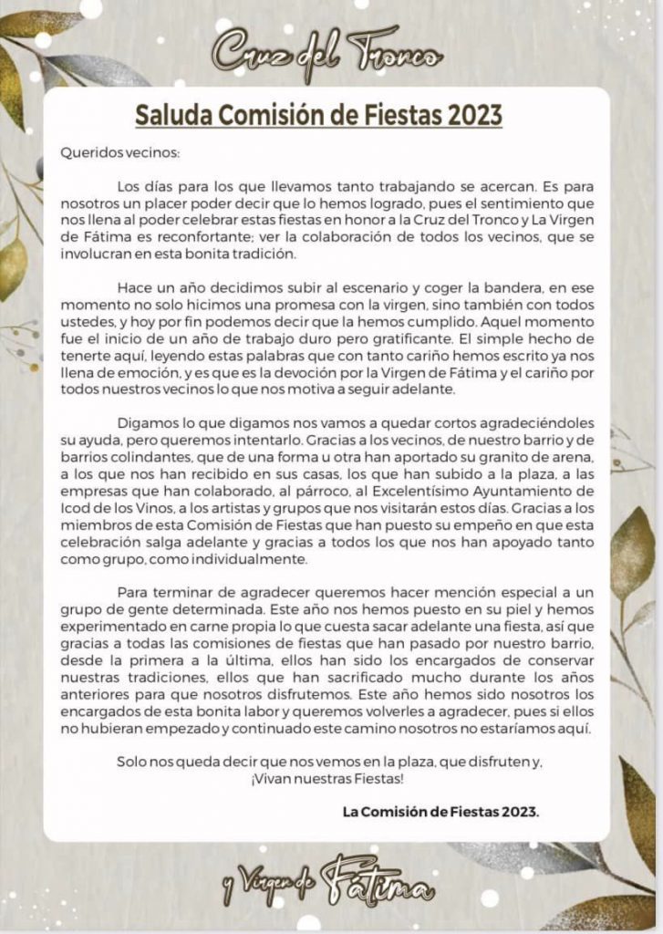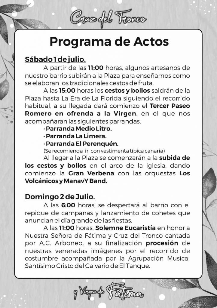 Programa de actos de las Fiestas en Honor a La Cruz del Tronco y a la Virgen de Fátima 2023, en el barrio de La Florida en el municipio de Icod de los Vinos, Tenerife. Del 24 de junio al 3 de julio de 2023.